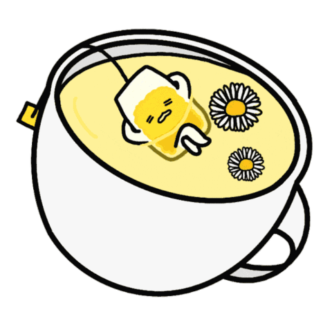 A cute cartoon tea bag relaxes in a teacup filled with warm tea and chamomile flowers, enjoying a peaceful rest.