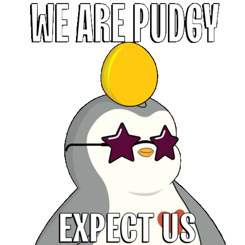 A cool Pudgy Penguin with star sunglasses and a yellow hat gives a thumbs up, declaring "WE ARE PUDGY EXPECT US".