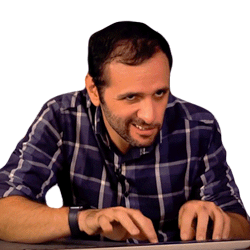 Ibere Thenorio from Manual do Mundo typing very fast on a keyboard with an intense expression.