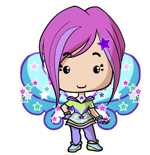 Cute chibi Tecna from Winx Club, with purple hair, star-adorned wings, and a vibrant green and purple outfit.
