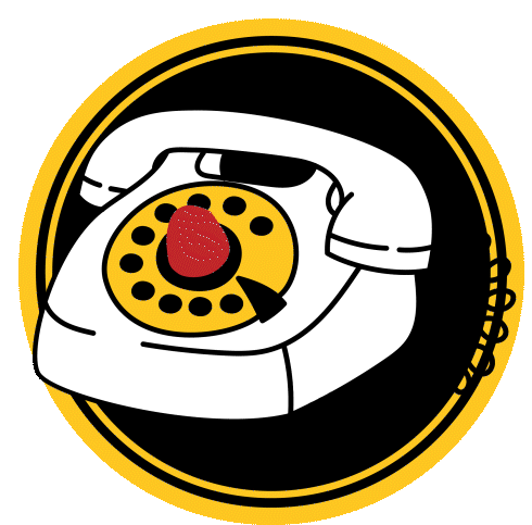 Animated sticker of a classic white rotary telephone with a yellow dial, rotating slightly within a black and yellow circle.