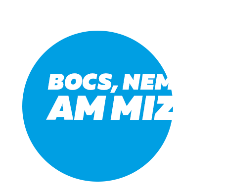 Telenor Hungary's 'BOCS, NEM AM MIZ #BELEFÉR' slogan sticker, featuring a blue circle with yellow text, promoting their campaign.