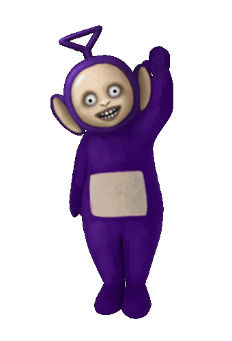 A creepy, cursed Tinky Winky Teletubby with a human-like face waves its arm in a teleporting animation.