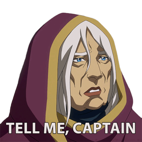 Majestra, from Masters of the Universe, urgently asks 'Tell me, Captain' with a serious and questioning expression.
