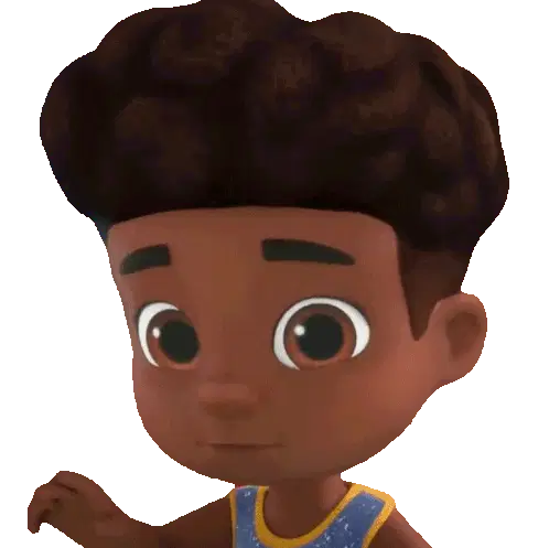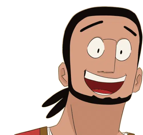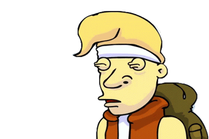 An animated character with a headband and backpack thinks deeply, then suddenly gets a brilliant idea, smiling brightly.