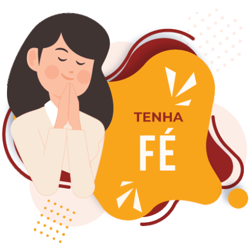 A serene woman with closed eyes and hands clasped in prayer, radiating peace and hope with the message 'Tenha Fé' (Have Faith).