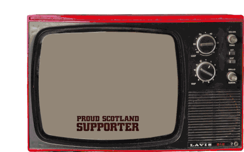 A retro TV displays the Tennent's logo and 'Proud Scotland Supporter' text, celebrating Scottish pride.