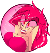 a cartoon character with pink hair and red eyes is smiling .