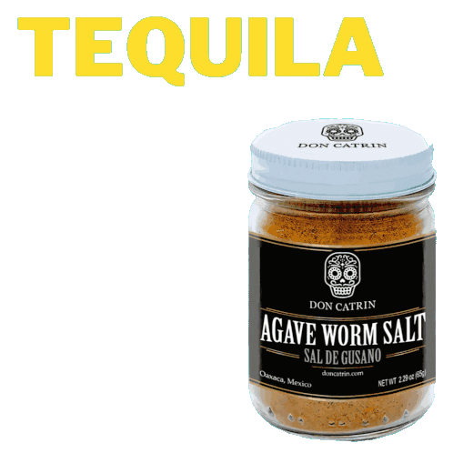 A vibrant sticker featuring a tequila shot with a lime, accompanied by a jar of Don Catrin Agave Worm Salt (Sal de Gusano).