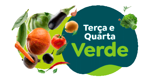 Animated sticker promoting 'Terça e Quarta Verde' (Green Tuesday and Wednesday) with fresh fruits and vegetables.