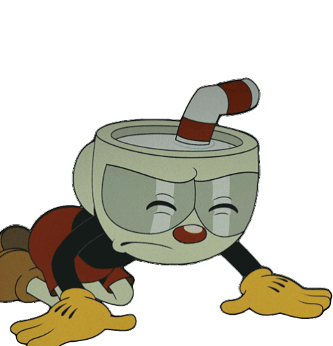 Cuphead from The Cuphead Show is shown in a terrified and petrified state, crouching with gritted teeth.