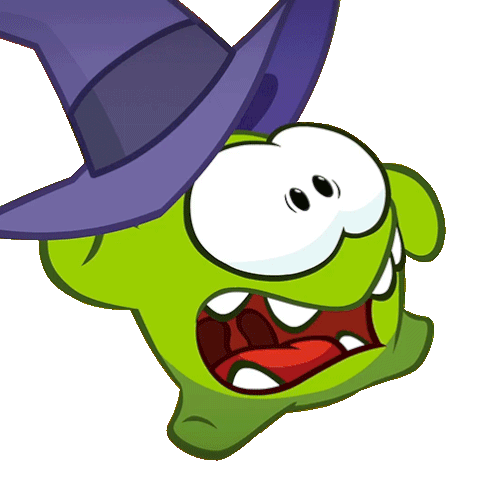 Om Nom from Cut the Rope is depicted looking terrified and screaming, wearing a purple witch hat.