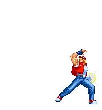 Terry Bogard unleashes his iconic Power Geyser attack, a powerful column of fire erupting from the ground in this classic fighting game animation.