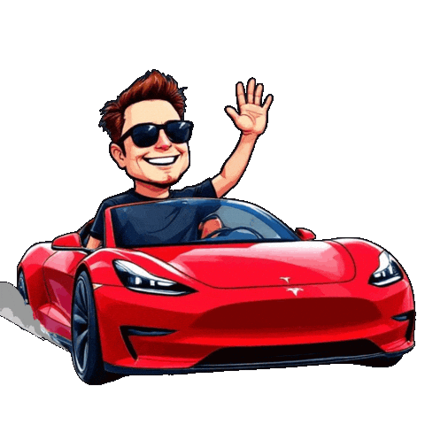 a cartoon man is driving a red tesla model s and waving