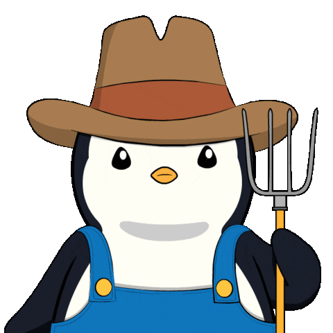 A Pudgy Penguin character dressed as a farmer, wearing a cowboy hat and blue overalls, holding a pitchfork.
