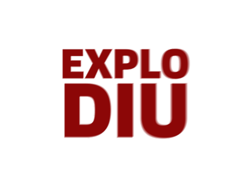 The red text 'EXPLO DIU' dramatically shatters and explodes into many small pieces, creating a dynamic visual effect.