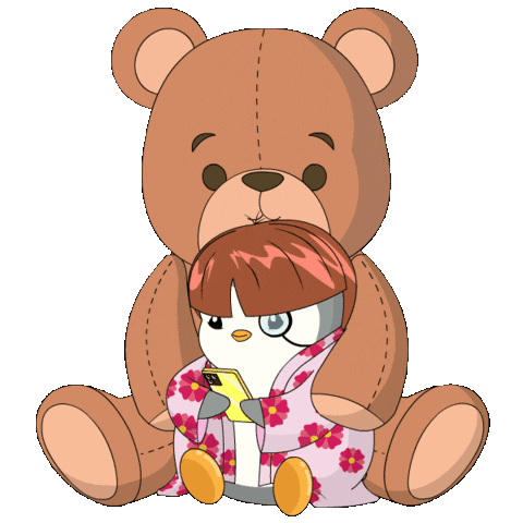A cute Pudgy Penguin with hair, wearing a kimono, texts on a phone while being hugged by a large teddy bear.