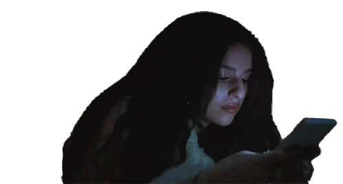 Renforshort intently texting on her phone, illuminated by the screen in a dark setting.
