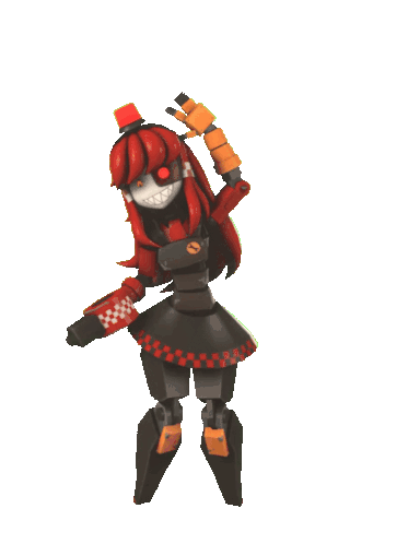 The TF2 SFM character Mimi, a red-haired robot with orange arms, stands and waves, showcasing her unique design.