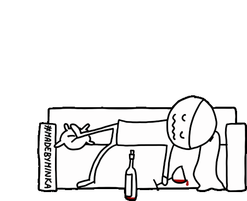 Madebyminka stick figure exhausted on a couch with a glass of wine, celebrating TGIF and relaxing after a long week.