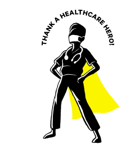 A healthcare hero, possibly a doctor or nurse, stands in a superhero pose with a yellow cape, mask, and stethoscope, expressing gratitude.