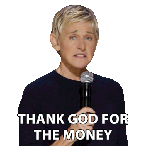 Ellen DeGeneres holds a microphone, expressing "Thank God For The Money" with a serious or sarcastic look.