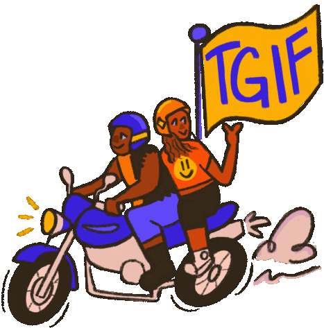 Ari Bennett and a friend ride a motorcycle, celebrating Friday with a 'TGIF' flag, spreading good vibes for the weekend.