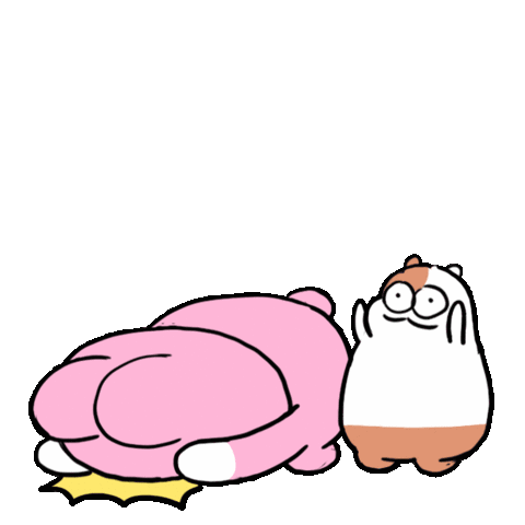 A pink blob creature with a small white companion bows and puts its hands together, expressing thanks or begging.