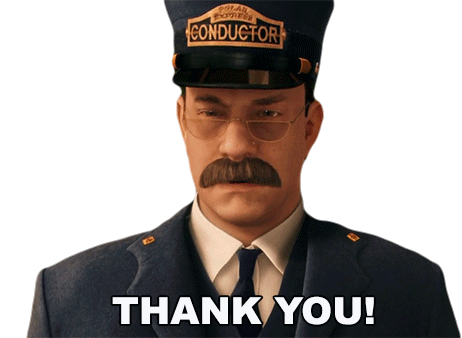 The Conductor from The Polar Express, portrayed by Tom Hanks, expresses gratitude with a clear 'Thank You!'.