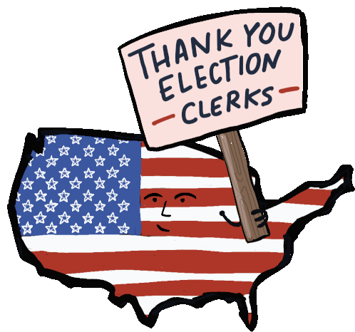 A smiling United States map, colored like the American flag, holds a sign saying "Thank You Election Clerks."