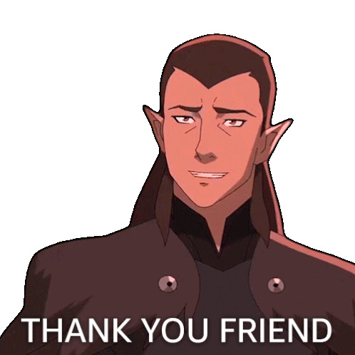 Vax'ildan from The Legend of Vox Machina expresses gratitude with a subtle smile and the message 'Thank You Friend'.