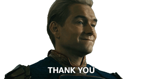Homelander from The Boys gives a sarcastic thank you with a forced smile, eyes closing and opening.