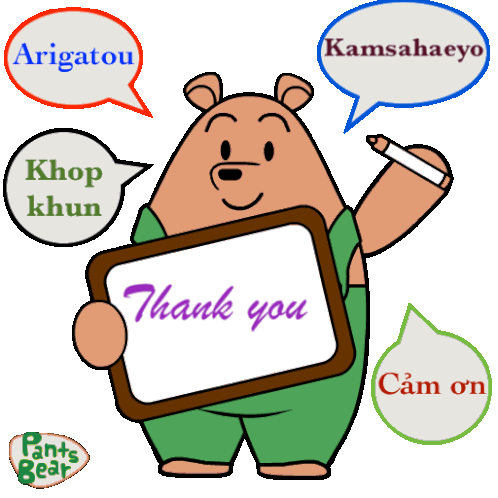 A friendly cartoon bear expresses gratitude, holding a 'Thank you' sign and speech bubbles in Japanese, Korean, Thai, and Vietnamese.