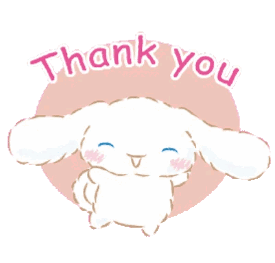 Cinnamoroll, the adorable Sanrio character, waves happily with a 'Thank you' message on a pink background, expressing gratitude.