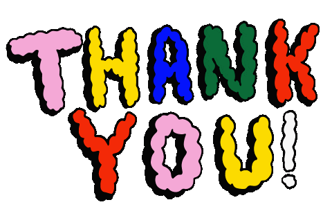An animated sticker featuring the words 'Thank You' in colorful, vibrant letters, expressing gratitude.