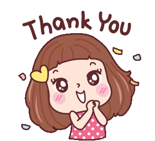 A cute cartoon girl with clasped hands expresses gratitude with 'Thank You' text and floating confetti.
