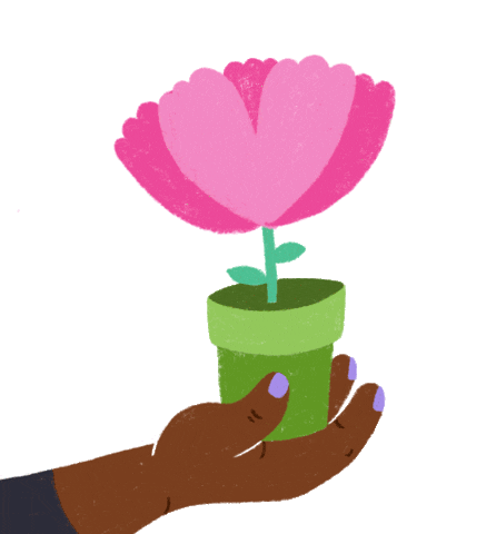 An animated hand holds a potted pink heart-flower, with "Thank you" text, hearts, and butterflies appearing.
