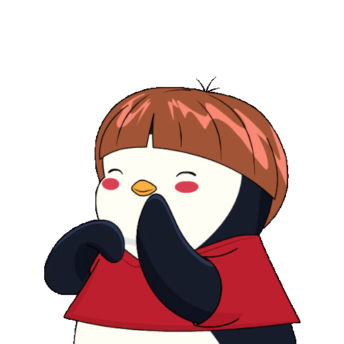 A cute penguin with a bowl cut blushes and covers its mouth, expressing shyness or gratitude.