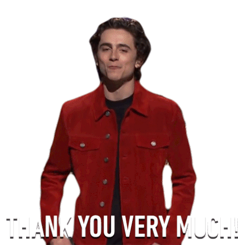Timothée Chalamet, wearing a red jacket, smiles and says 'Thank You Very Much!' in a grateful gesture.