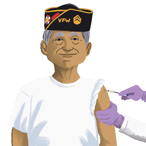 A smiling veteran, wearing a VFW hat, receives a vaccine shot in his arm, symbolizing health and gratitude for service.