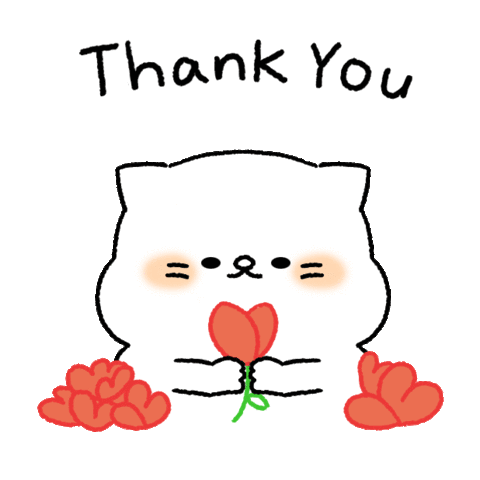 A cute white cat holding a red tulip, surrounded by red flowers, expresses gratitude with 'Thank You' text.
