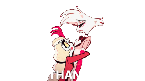 Charlie Morningstar embraces Angel Dust, who looks surprised, with "THAN" visible. A Hazbin Hotel moment of appreciation.