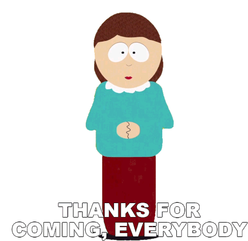 Liane Cartman from South Park expresses gratitude, saying 'Thanks for coming, everybody' with a welcoming gesture.