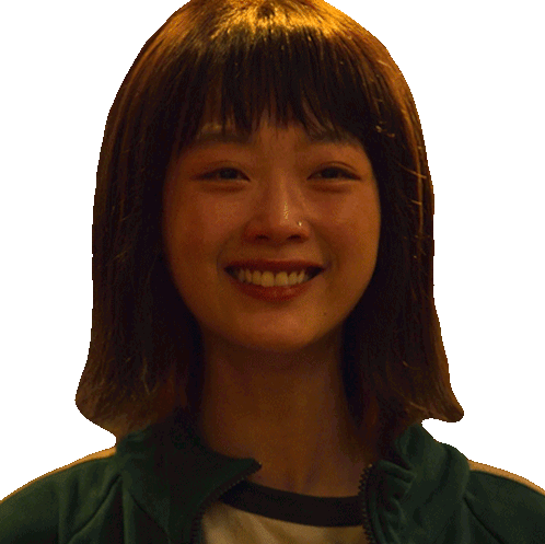 Ji-yeong from Squid Game smiles warmly and expresses gratitude with a 'Thanks' caption, showing appreciation.