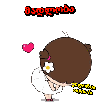 A cute cartoon girl in a white dress expresses 'Thanks' (მადლობა) with 'euphoria' in this charming animated sticker.