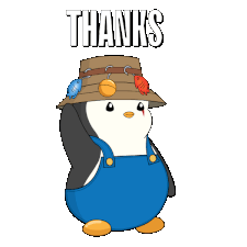 A friendly pudgy penguin in blue overalls and a fishing hat, raising a flipper to say 'THANKS'.