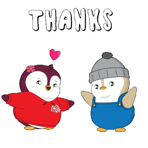 a couple of penguins are standing next to each other with hearts and the words thanks above them