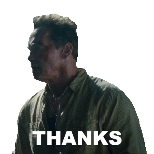 Arnold Schwarzenegger from Expendables 2, as Trench, expresses gratitude with the word "THANKS" appearing on screen.