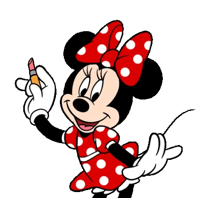 Minnie Mouse, in her red polka-dot dress, cheerfully writes 'Thank you!' with a pencil, then holds up lipstick.
