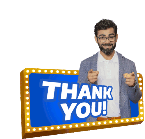 Virat Kohli, the Indian cricketer, points at the viewer from behind a bright 'THANK YOU!' sign with marquee lights.
